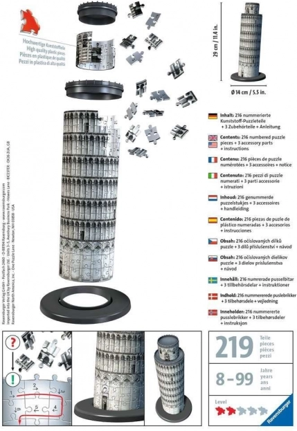 Ravensburger aduce din nou inovație în lumea puzzle-urilor cu un model 3D al celebrului Turn Înclinat din Pisa. Acest model conține piese speciale care se potrivesc exact la locul lor și nu necesită lipici, făcând întreaga operă durabilă și stabilă.