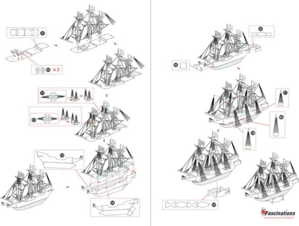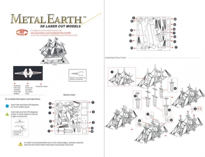 Scoateți piesele individuale din foile metalice; dacă este necesar, folosiți cleștișori tăietori mici (neincluși). Piesele se îmbină între ele cu ajutorul unor zăvoare formate dintr-un cârlig (lăbuță) și un orificiu. Îndoiți cârligul cu clești subțiri mici (neincluși) și îmbinați treptat toate zăvoarele până când obțineți o piesă de măiestrie foarte realistă!