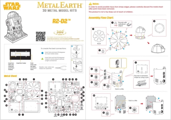Scoateți piesele individuale din plăcuțele metalice; dacă este necesar, folosiți clești mici de tăiat (neincluși). Piesele se îmbină între ele cu ajutorul unor încuietori formate dintr-un cârlig și un orificiu. Îndoiți cârligul cu ajutorul unor clești subțiri mici (neincluși) și îmbinați treptat toate încuietorile până când obțineți o piesă de rezistență foarte realistă!