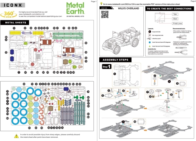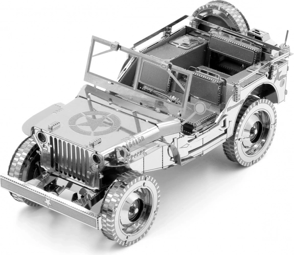Provocare palpitantă, plăcerea asamblării și un rezultat sclipitor – acestea sunt modelele METAL EARTH! Model din gama premium ICONX, în ambalaj cadou exclusiv, te va cuceri prin prelucrarea și mai rafinată a detaliilor! Asamblarea puzzle-ului 3D METAL EARTH ICONX necesită răbdare și îndemânare. Rezultatul compensează pe deplin efortul depus! Micile replici sunt o decorațiune deosebit de impresionantă și atrăgătoare nu doar acasă, ci și la birou sau la școală. Din foi dreptunghiulare de oțel (21 x 11 cm) cu părți ale unor monumente mondiale, mijloace de transport celebre, instrumente muzicale sau animale, vor prinde contur sub mâinile tale modele fascinante, lucrate în detaliu. Aspectul autentic al puzzle-ului 3D METAL EARTH ICONX este obținut datorită gravării laser detaliate. Pachetul conține 2 foi de oțel, o pensetă și un ghid de asamblare. Uneltele nu sunt incluse în pachet. PROCEDURĂ DE LUCRU: Scoateți piesele din foile metalice; la nevoie folosiți cleștișori tăietori mici (neincluși). Piesele se îmbină între ele cu ajutorul unor zăvoare formate dintr-un cârlig (lăbuță) și un orificiu. Îndoiți cârligul cu ajutorul unor clești fini mici (neincluși) și îmbinați treptat toate zăvoarele până când obțineți o capodoperă foarte realistă! Vârsta recomandată: de la 14 ani. Jeep Willys MB a fost un vehicul utilitar ușor american, apărut în timpul celui de-al Doilea Război Mondial. Denumirea sa, jeep, a devenit sinonim pentru automobilul de teren în întreaga lume. Acest vehicul legendar a fost probabil cel mai cunoscut vehicul al celui de-al Doilea Război Mondial. Mai mult pe Wikipedia Dimensiunea puzzle-ului asamblat cca 9,7 x 3,8 x 4 cm