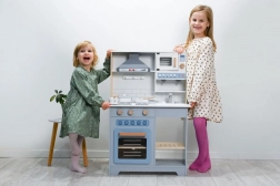 Această bucătărie interactivă din lemn cu hotă oferă copiilor o experiență culinară autentică într-o formă sigură și durabilă. Elementele realiste precum aragazul, cuptorul, chiuveta și cuptorul cu microunde sprijină imaginația și jocul de rol, în timp ce butoanele rotative și tastele sporesc experiența senzorială a jocului.