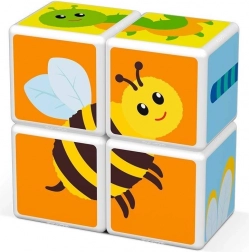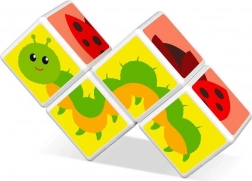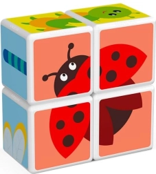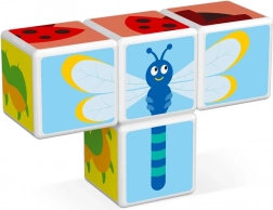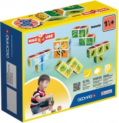Cuburi din plastic cu motive de insecte. Cuburile sunt magnetice, astfel încât se pot construi obiecte tridimensionale. Copiii pot construi o buburuză, o omidă, o libelulă, un furnicar, o albină și o lăcustă sau un coș de fum ori un țarc pentru animăluțe. Extindeți posibilitățile de joacă prin achiziționarea altor seturi GEOMAG Magicube. Cuburile pentru copii Magicube susțin coordonarea și motricitatea, dezvoltă imaginația și gândirea logică și îi motivează pe copii să creeze și să povestească. Pachetul conține 4 cuburi magnetice și 6 cartonașe cu propuneri de asamblare a animalelor. Fabricat în Elveția. video ilustrativ al cuburilor magnetice Geomag Magicube