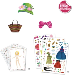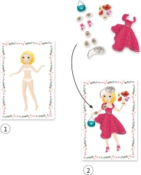 - 8 carduri cu păpuși, 4 coli cu autocolante reutilizabile cu haine și accesorii