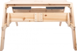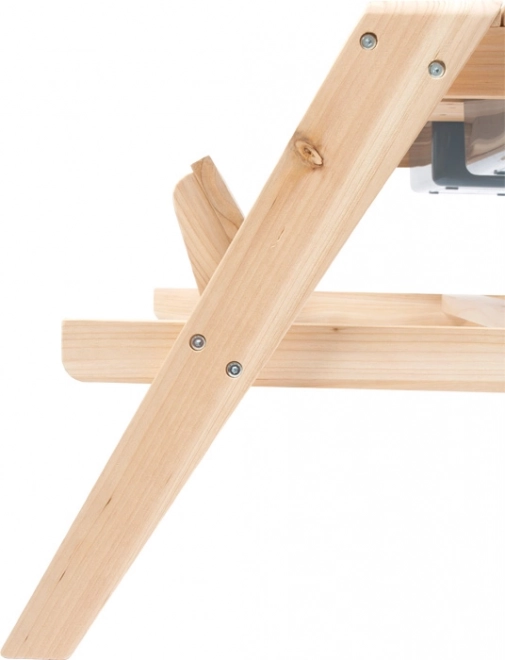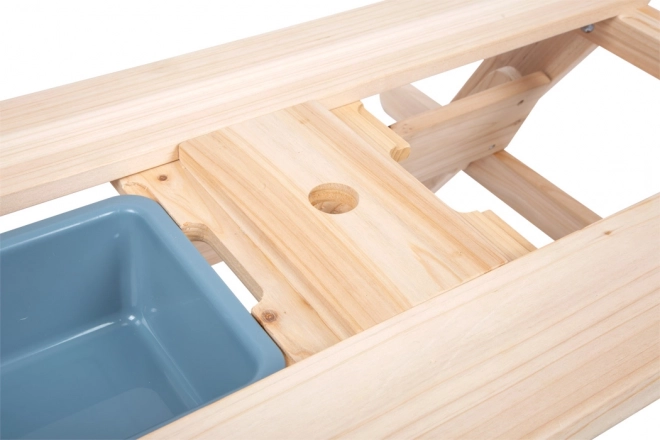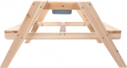 Masa de lemn servește ca masă de picnic și suprafață de joacă cu tăvițe pentru nisip sau apă.