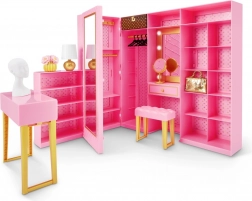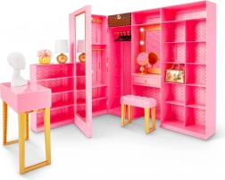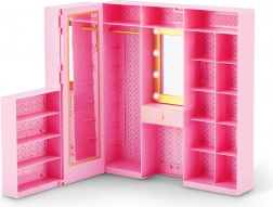 Lumina integrată în jurul oglinzii rotunde adaugă atmosfera unui garderobă adevărată și ușurează coafarea păpușilor.