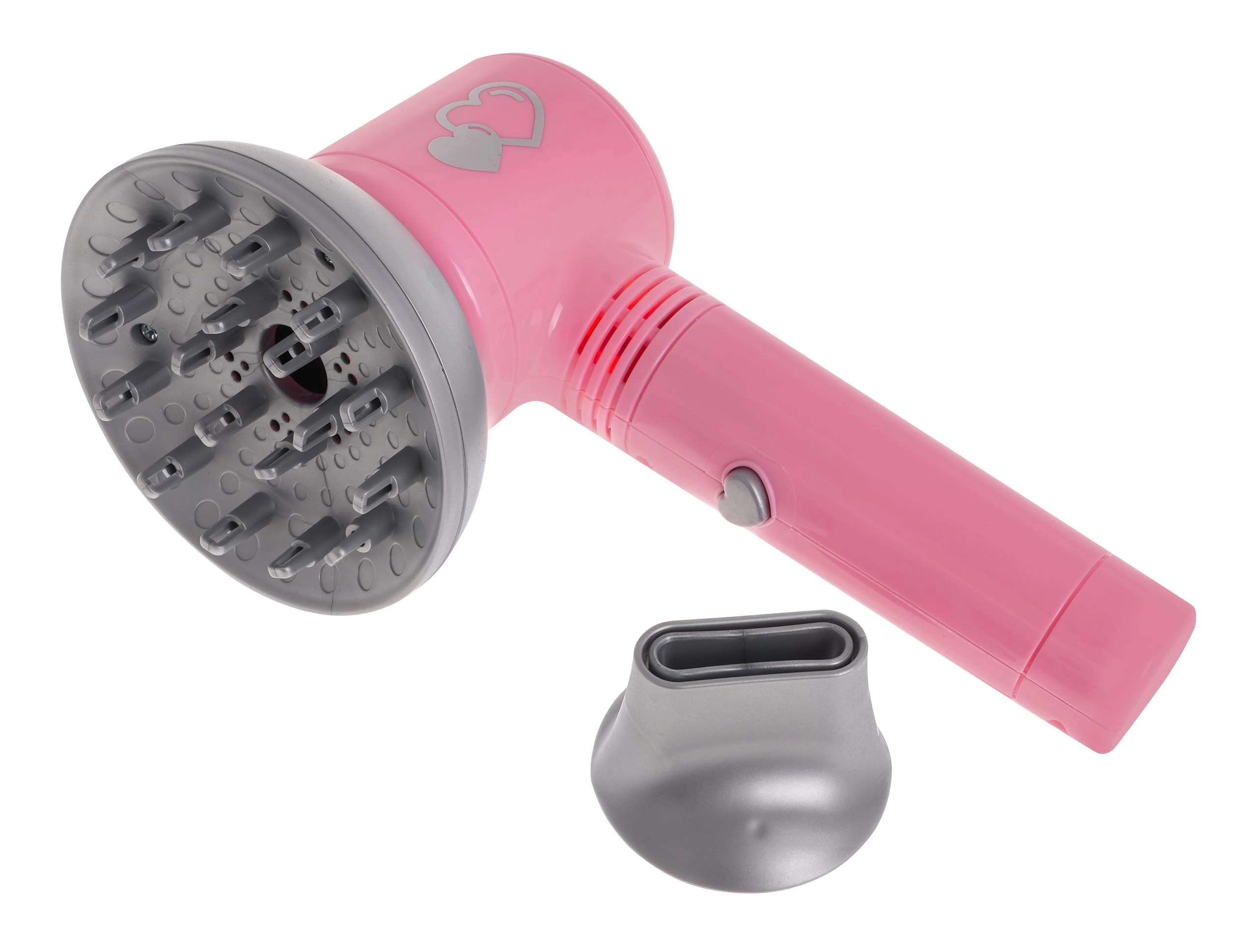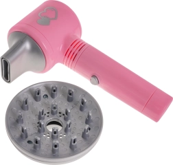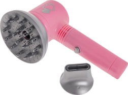Setul de instrumente de coafură pentru copii include tot ce are nevoie o mică stilistă pentru primele încercări de coafat. Uscătorul este alimentat cu baterii și oferă un flux ușor de aer, care simulează fidel uscarea reală a părului. Dispune de asemenea de două accesorii interschimbabile - difuzor și concentrator.