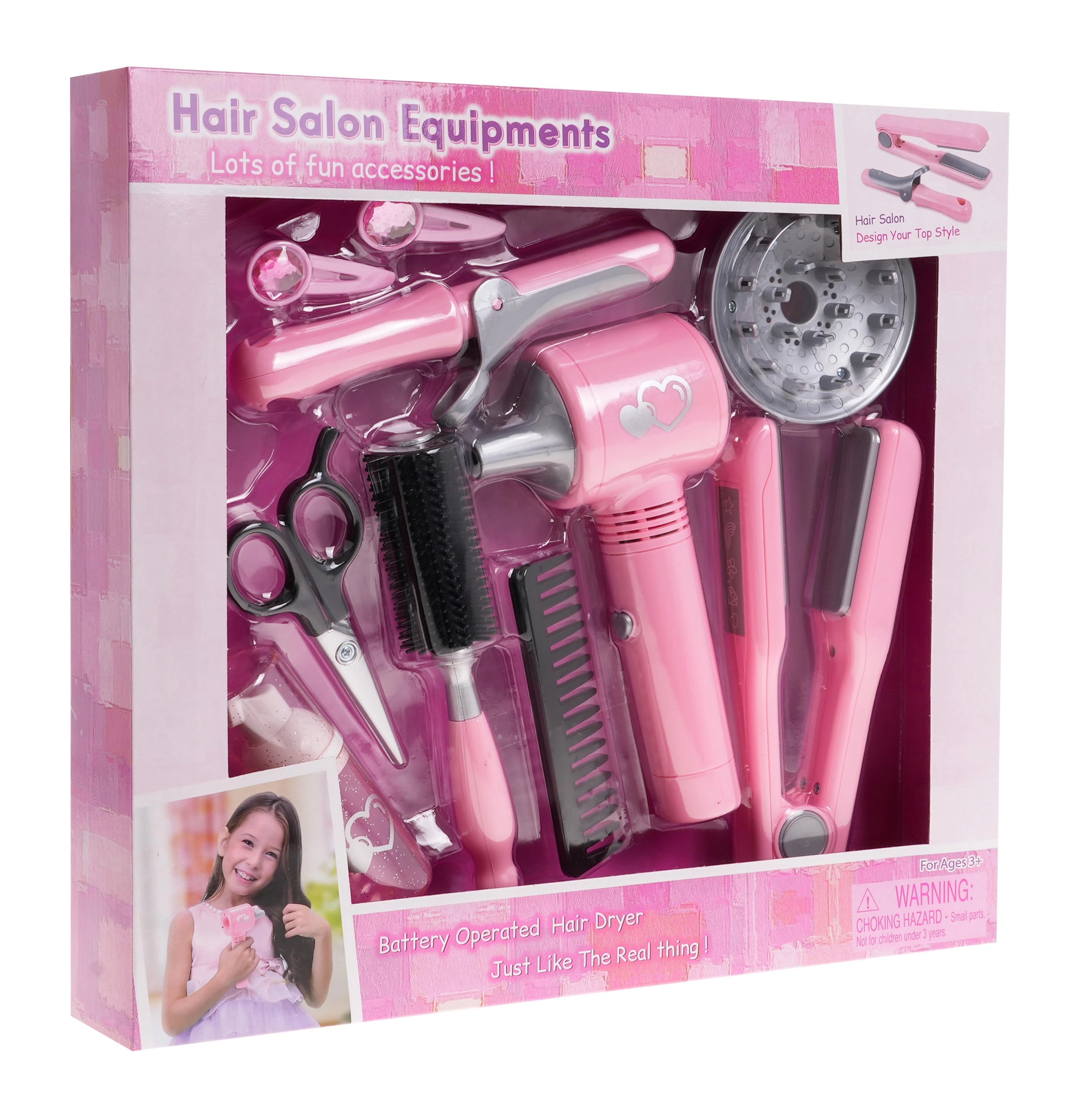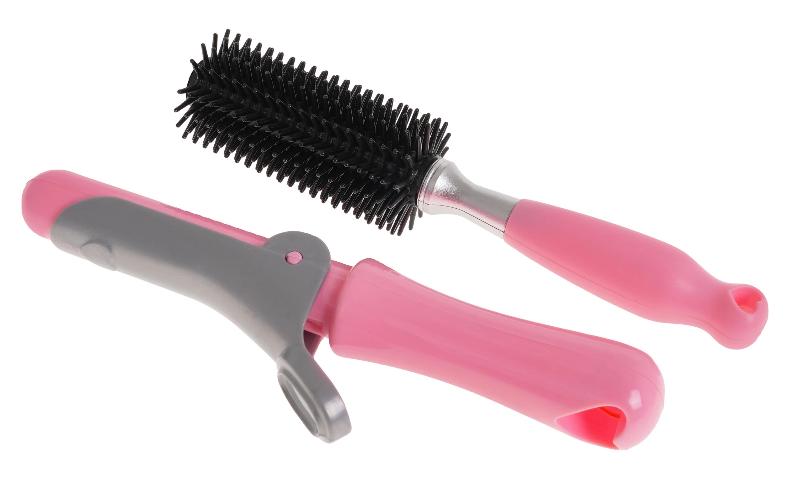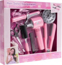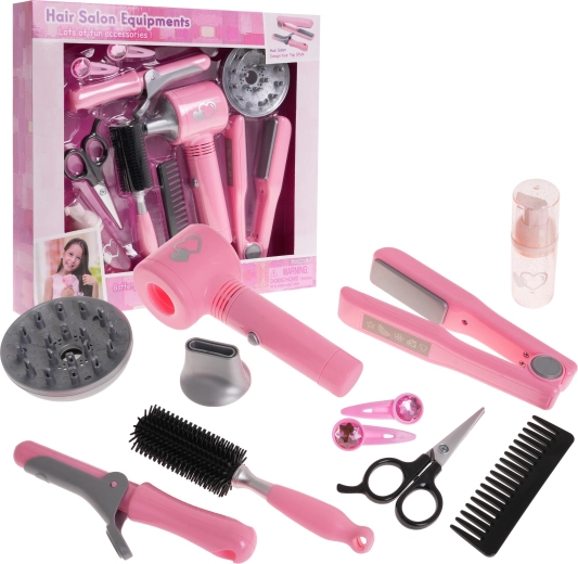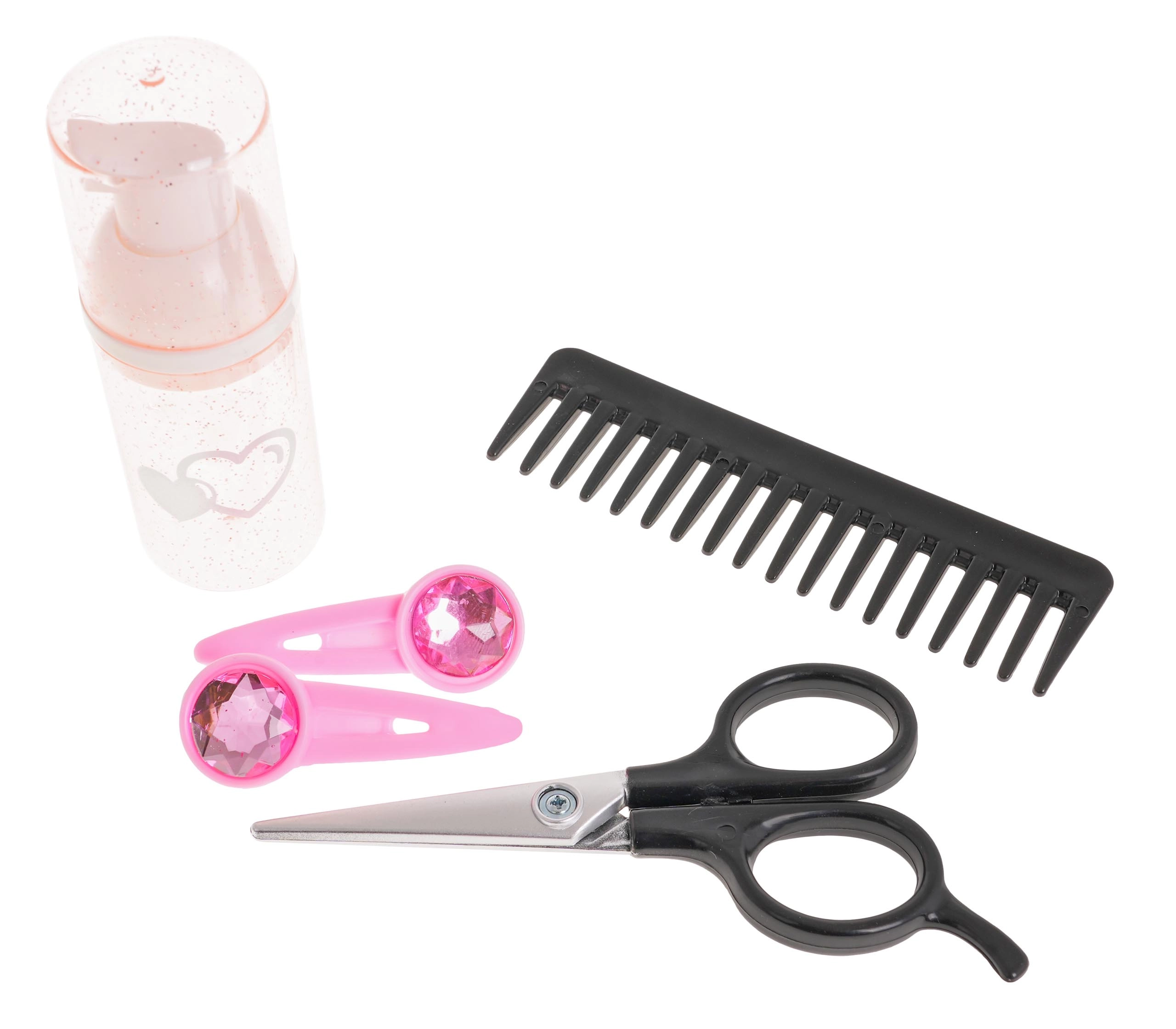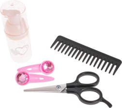 Setul include de asemenea ondulator și placă de îndreptat părul, pieptene, perie, foarfece, sticluță și agrafe de păr, oferind tot ce este necesar pentru joacă creativă.