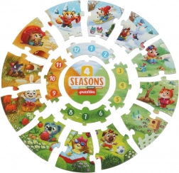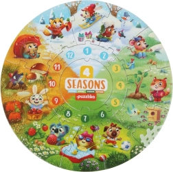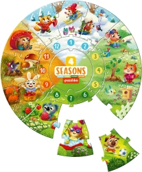 Puzzle Cele patru anotimpuri de la marca Puzzlika atrage prin designul său modern și creativ și este destinat copiilor de la vârsta de 2 ani. Puzzle-ul completat formează o imagine mare rotundă cu un diametru de 28 cm, care ilustrează activități în aer liber caracteristice fiecărui anotimp. Acest joc educativ ajută copiii să-și dezvolte gândirea logică, imaginația și motricitatea fină.