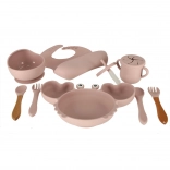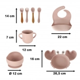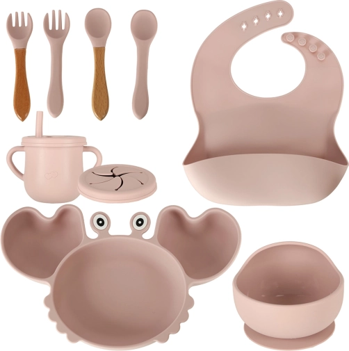 Set complet de masă din silicon, 9 piese, pentru cei mici, cu farfurie jucăușă în formă de crab. Conține totul pentru hrănire comodă și pentru mâncat independent: farfurie și castron cu ventuză, cană de antrenament cu două capace și pai, 2 lingurițe, 2 furculițe și bavetă practică cu buzunar. Fabricat din silicon sigur, fără BPA, se curăță ușor și ajută la reducerea dezordinii datorită ventuzelor și buzunarului colector.