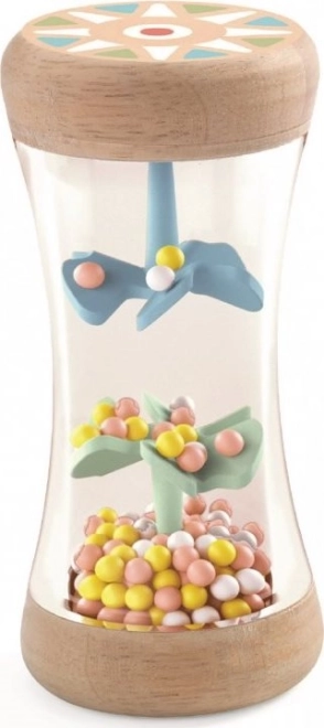 Drăgălașa zornăitoare combină lemnul cu un cilindru transparent din plastic, în care cad mărgelele curcubeu și se rotesc elicile. În mișcare, creează un efect plăcut și liniștitor de „baghetă de ploaie”, care atrage bebelușul și îi susține concentrarea.