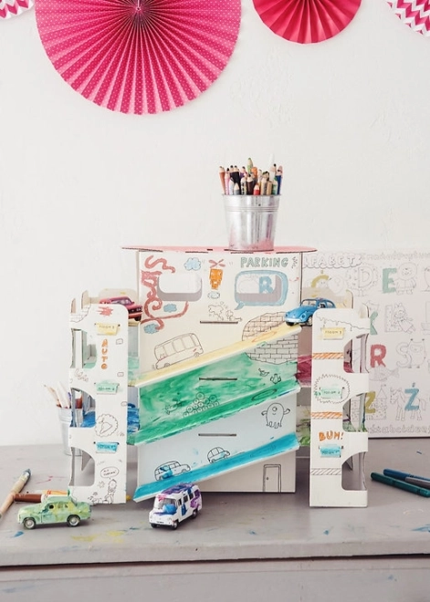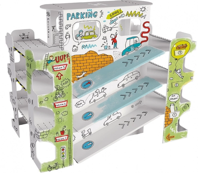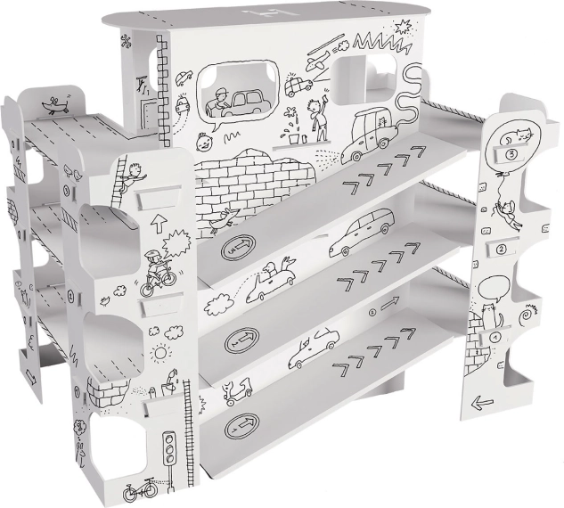 Tiparul negru clar, profesional este ideal pentru colorat cu creioane, carioci, markere și vopsele. Cartonul absoarbe bine umezeala, nu se încrețește și nu pătează. Spațiile deschise, rampele și rafturile invită la creativitate, joc de parcare și dezvoltarea imaginației copiilor.
