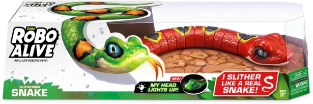 Slithering Snake Robo Alive este o jucărie interactivă pentru iubitorii de natură, care imită perfect un șarpe adevărat. Doar uită-te la culorile sale vibrante, corpul segmentat, limba mobilă și ochii amenințători pentru a simți fiori pe șira spinării! Joaca cu Șarpele Robo va fi și mai fascinantă, deoarece gura lui strălucește în întuneric. Astfel, îl vei vedea chiar și noaptea cum se ascunde printre mobilă!