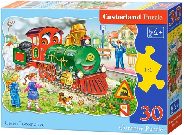 Puzzle colorat pentru copii cu motivul unei locomotive verzi oferă 30 de piese și, după asamblare, formează o imagine cu dimensiunea de 32 × 23 cm. Ideal pentru primele încercări de asamblare, cu execuție de calitate și culori atrăgătoare care susțin concentrarea, răbdarea și dezvoltarea imaginației.