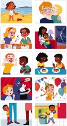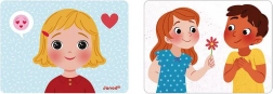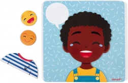 Emoții și sentimente - Acest joc magnetic îl ajută pe copil să recunoască emoțiile cu ajutorul cardurilor ilustrate care reprezintă diverse situații de viață. Pe fiecare card este afișat un chip care imită emoțional situația prezentată pe verso. Cu ajutorul magneților, copilul încearcă să asocieze expresiile potrivite cu situația dată. Există 2 niveluri de joc: se poate pur și simplu imita expresia feței de pe card, iar copiii mai mari pot încerca să ghicească ce emoții corespund situațiilor de viață prezentate. Oglinda îi permite copilului să imite diferitele expresii. Conținutul setului: - 1 placă din lemn - 27 magneți (10 fețe, 10 emoticoane, 7 piese de îmbrăcăminte) - 20 carduri care ilustrează situații de viață. Potrivit pentru copii de la 2 ani.