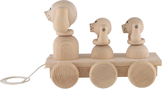 Această jucărie de tras din lemn va încânta orice copil mic. În timpul mersului, cei trei căței se mișcă adorabil, susținând primele lor pași și dezvoltând motricitatea și coordonarea. Lemnul natural de calitate și finisarea netedă asigură un joc sigur și distractiv.