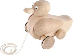 Drăgălașa rață de tras din lemn natural îi va încânta pe toți copiii care descoperă lumea primilor pași. Când este trasă, rața se leagănă și își mișcă capul, ceea ce susține abilitățile de coordonare și motivează în mod natural la mers. Prelucrarea din lemn de calitate și designul atemporal o fac o jucărie ideală pentru joaca de zi cu zi.