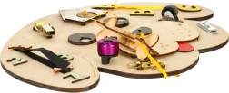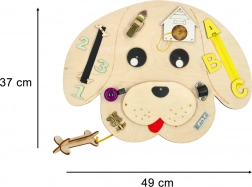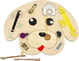 Placa senzorială din lemn, în formă de câine, dezvoltă la copii motricitatea fină, logica și concentrarea. Conține cifre și litere din lemn colorate, fermoar, catarame și încuietori, clopoțel și alte elemente interactive care susțin învățarea prin joc și dezvoltarea senzorială.