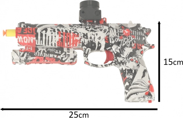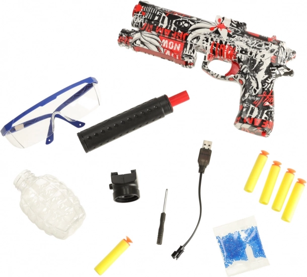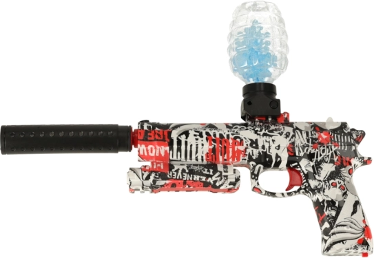 Pistolul electric pentru distracție trage cu două tipuri de muniție – proiectile din spumă și bile din hidrogel. Pachetul conține bile pentru preparare separată – bilele trebuie înmuiate în apă timp de 3–4 ore pentru a-și mări volumul.