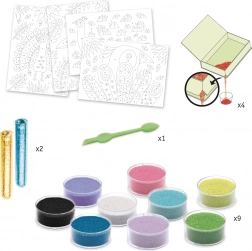 Setul conține: 4 imagini, 1 spatulă, 9 recipiente cu nisip colorat și 2 tuburi cu sclipici strălucitor.