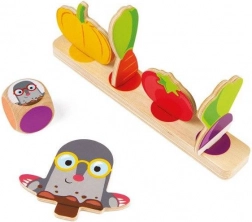 O tablă pătrată stabilă cu „straturi de grădină” și piese de legume din lemn, pictate în detaliu, invită la joacă și dezvoltă motricitatea fină, precum și recunoașterea formelor și culorilor.