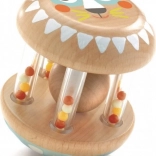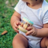 Zornăitoare din lemn cu mărgele și biluță, ușor de apucat de mâinile copiilor. Dimensiuni zornăitoare: 5,6 x 5,6 x 6 cm.