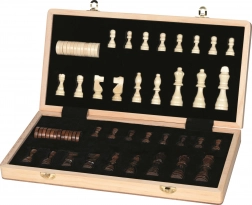 Descoperiți distracția clasică într-o execuție solidă din lemn. Setul șah și dame 2‑în‑1 oferă piese magnetice de calitate, care aderă bine pe câmpuri, și o tablă de șah pliabilă cu dimensiunile 38 × 38 cm. Datorită magneților, jocul este stabil atât acasă, cât și în călătorii.