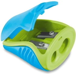 Bucurați-vă de o ascuțire curată și comodă acasă, la școală și în călătorii. Această ascuțitoare din plastic, cu rezervor și două orificii, păstrează așchiile în siguranță în interior, în timp ce capacul fix previne vărsarea și murdărirea conținutului penarului.