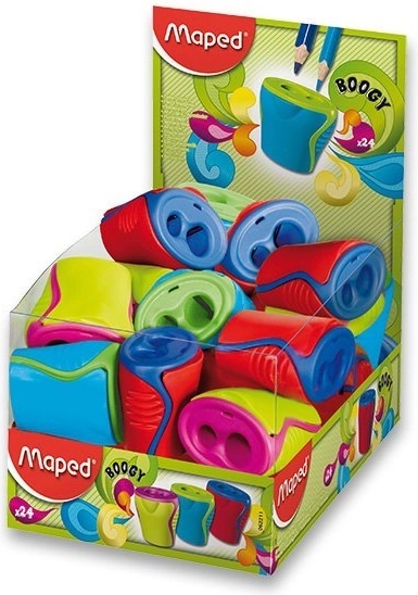 Ascuțitoarea dublă cu rezervor MAPED Boogy păstrează creioanele și creioanele colorate întotdeauna ascuțite. Oferă 2 orificii, recipient pentru resturi și închidere sigură, care previne dezordinea. Este rezistentă la șocuri și ideală pentru penar.