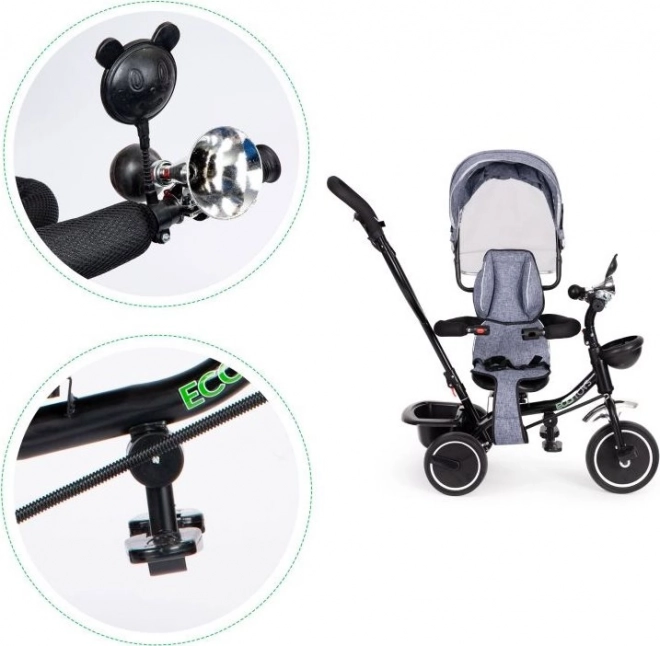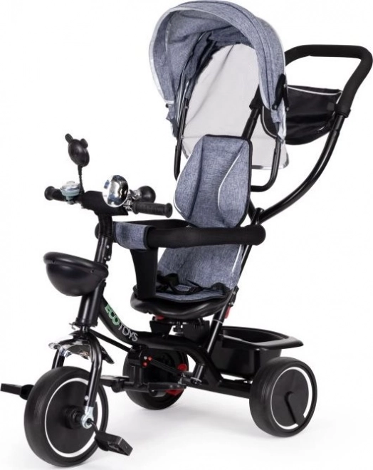 Trotineta ECOTOYS asigură confort datorită spătarului moale și centurilor de siguranță. Baldachinul detașabil protejează de soare sau ploaie.