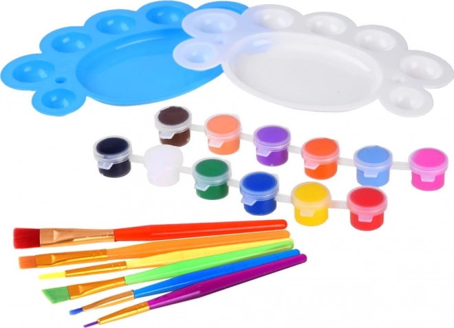 Bucuraţi-vă copiii cu un set de pictură creativă echipat cu tot ce este necesar! În pachet veţi găsi 12 culori, 2 palete pentru amestecarea culorilor, pensule de diverse grosimi, role pentru crearea formelor şi pensule cu capăt din spumă şi bureţi. Protecţia micilor artişti este un şorţ adorabil şi mânecuţe cu motive de animale. Copiii pot ştampila modele, amesteca culori şi crea astfel propriile opere de artă.