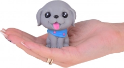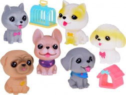 Fiecare câine emite un sunet amuzant de sfârâit când este apăsat și are o mică deschidere la bază. Setul conține diverse rase cum ar fi bulldogul, shiba inu, pudelul, pointerul german cu păr scurt, mopsul și chihuahua cu păr scurt, fiecare cu accesoriile sale adorabile. De asemenea, include un mini căsuță și un transportor.