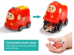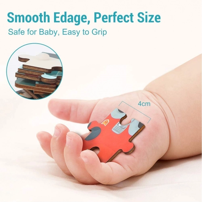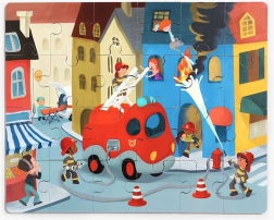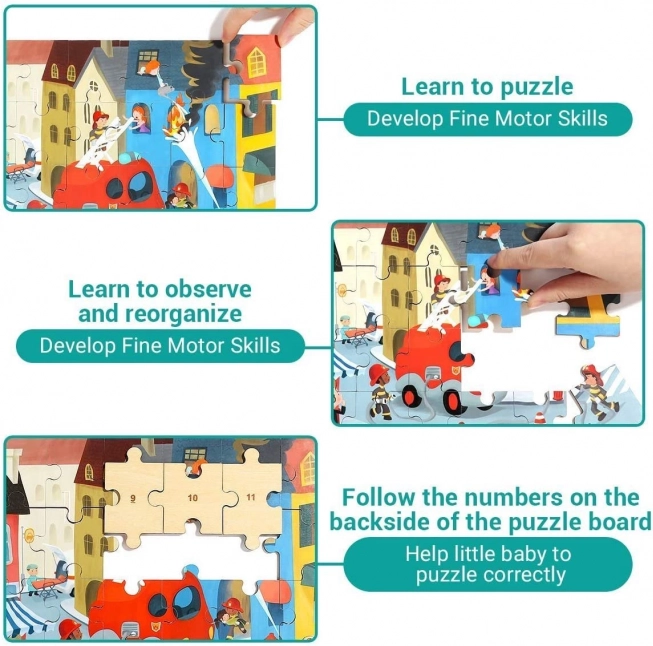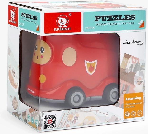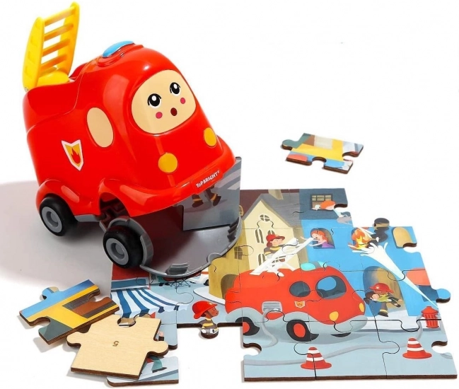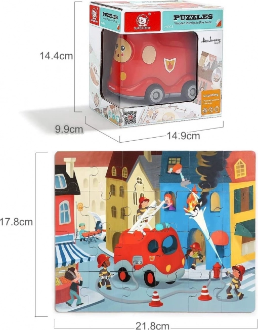 Combinație practică între puzzle din lemn și mașină de pompieri din plastic cu roți. Joaca și depozitarea pieselor într-un singur loc datorită capacului inteligent de depozitare.