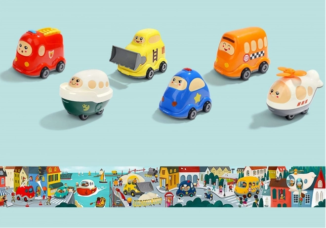 Mașinuța are în partea de jos un capac care se deschide, în care copiii pot depozita piesele de puzzle sau mici comori. Dacă achiziționați și alte modele din mini-serie (mașină de poliție, autobuz școlar, buldozer, elicopter, navă), marginile imaginilor se continuă și formează un puzzle panoramic captivant cu tematică de transport.