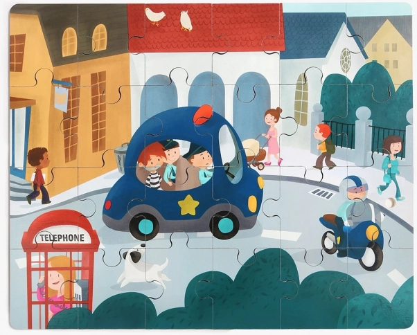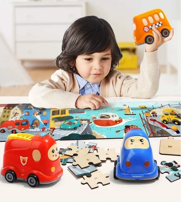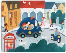 Achiziționați și alte mijloace de transport (mașină de pompieri, autobuz școlar, buldozer, elicopter, navă). Piesele de margine se îmbină între ele și rezultă un puzzle panoramic lung, precum și o colecție de jucării care se deplasează.