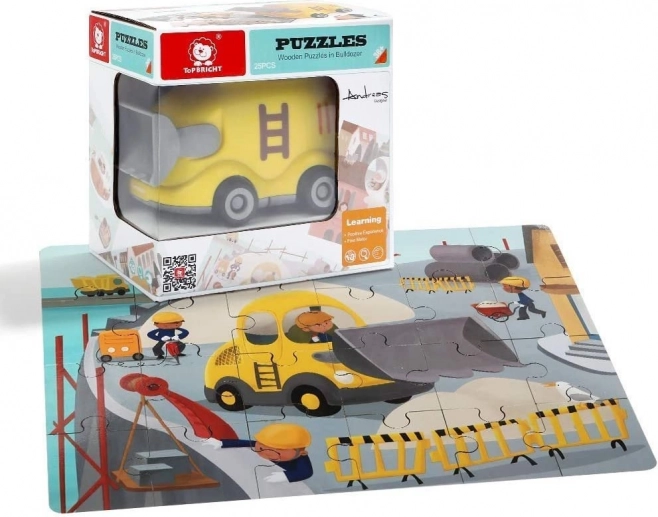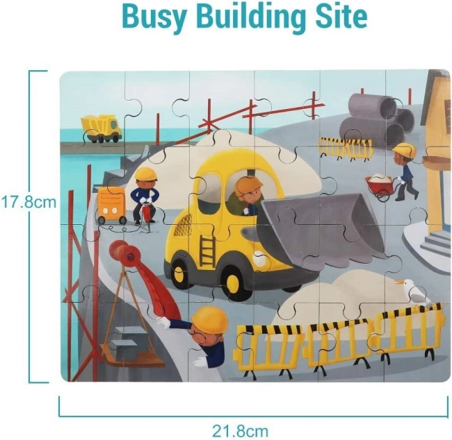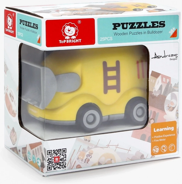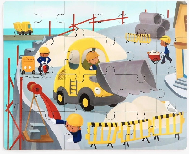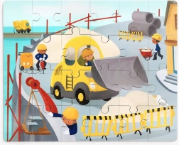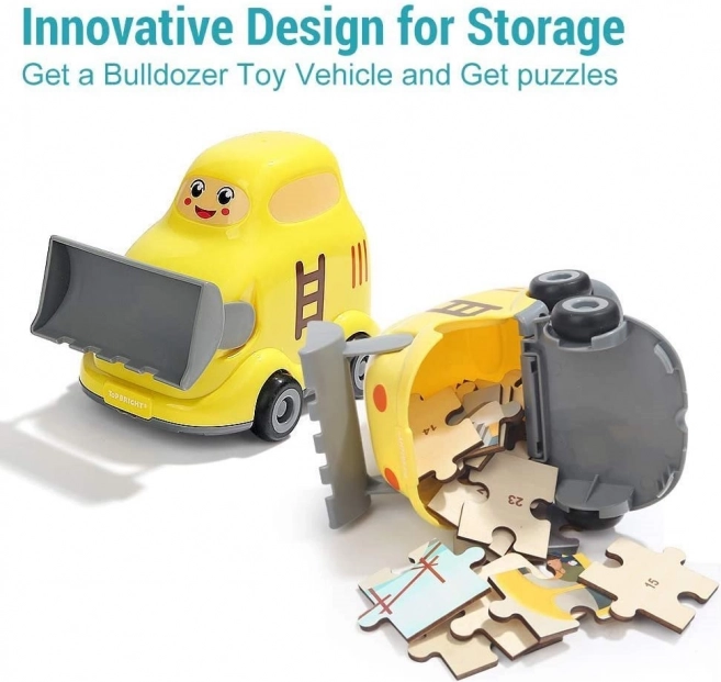 Descoperiți o jucărie isteață care îmbină bucuria jocului cu învățarea. Puzzle-ul din lemn cu tema mijloacelor de transport (șantier) este ascuns chiar în buldozerul din plastic. Acesta are o execuție netedă și sigură, roți pentru deplasare și un capac inferior rabatabil, în care copiii își pot pune comod puzzle-ul sau comorile.