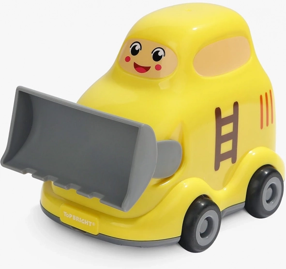 Buldozerul din plastic rezistent are margini netede, se deplasează pe roți și oferă un capac practic rabatabil pentru depozitarea pieselor sau a micilor comori.