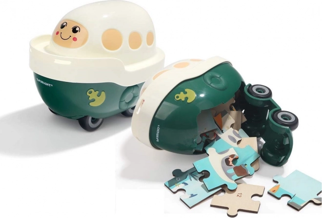 Bărcuța din plastic cu față drăgălașă este o jucărie complet funcțională. Capacul inferior se deschide și poate găzdui întregul puzzle sau alte mici comori.