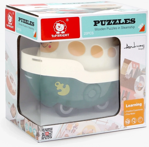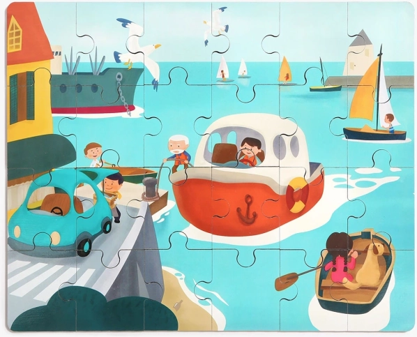 Acest original 2-în-1 îmbină joaca cu vehiculele și bucuria asamblării. Puzzle-ul din lemn cu tematică de transport sprijină concentrarea, motricitatea fină și dezvoltarea logicii. Bărcuța este o jucărie independentă pe roți și ascunde în interior un spațiu sigur pentru depozitarea pieselor sau a comorilor copiilor.