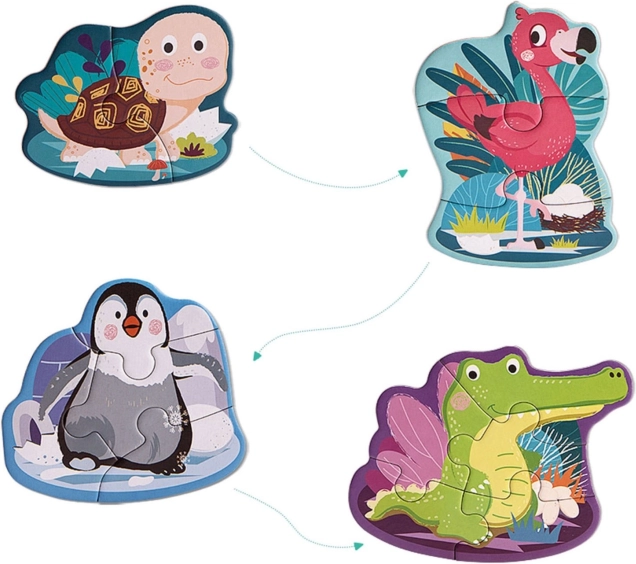 Patru puzzle-uri cu creștere treptată a numărului de piese le sporesc copiilor încrederea și îi învață să asambleze pas cu pas.