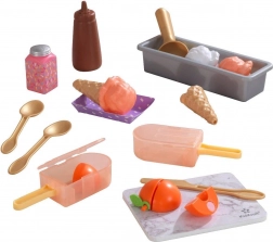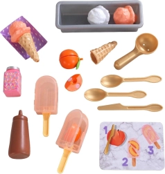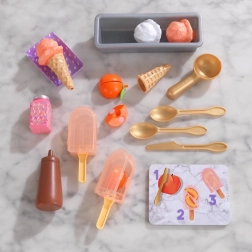 - Forme pentru înghețată pe băț, cornete, lingură pentru înghețată, fructe și sticluțe pentru „toppinguri”