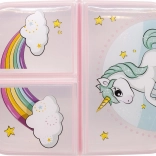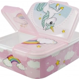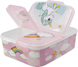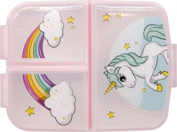 Cutia multi pentru gustare, stilată, cu motiv vesel de unicorn și curcubeu, îi ajută pe copii să păstreze mâncarea bine separată și proaspătă. Trei compartimente individuale sunt ideale pentru fructe și legume, sandvișuri și mici gustări. Construcția solidă rezistă căderilor și loviturilor obișnuite, ceea ce face cutia o alegere excelentă pentru utilizarea de zi cu zi.