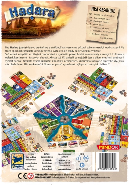 Pornește într-o călătorie prin culturi și clădește-ți propria civilizație în trei epoci. În strategia bine echilibrată Hadara alegi personalități, dezvolți economia, cultura și forța militară și, cu ajutorul roții de selecție a cărților, construiești un motor eficient care te conduce spre onoare, glorie și puncte de victorie.