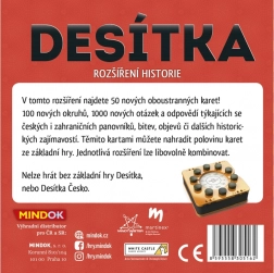 Extindeți jocul vostru de cunoștințe preferat cu un pachet tematic despre istorie. Această extensie aduce 50 de cărți față-verso, 100 de domenii noi și 1000 de întrebări și răspunsuri despre monarhi, bătălii, descoperiri și alte curiozități istorice. Cărțile pot fi combinate liber cu alte extensii și pot înlocui jumătate din cărțile jocului de bază. Nu se poate juca fără jocul de bază Desítka sau Desítka Cehia.