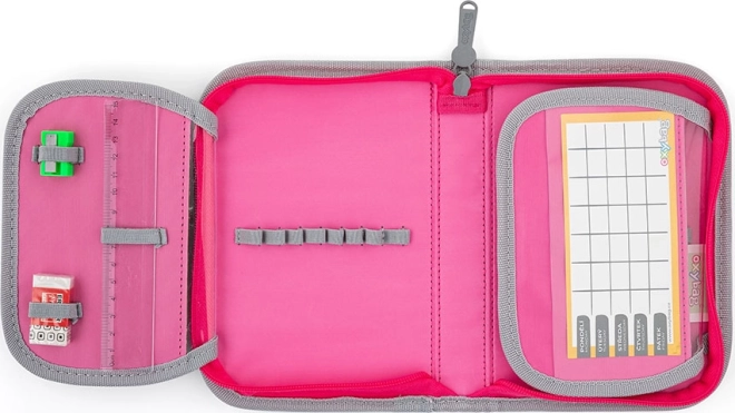 Cauți un penar practic și în același timp drăguț pentru școală? Penarul cu suprafață plușată Unicorn de la Oxybag impresionează prin textura catifelată, organizarea clară și execuția durabilă. Datorită celor două clapete interioare și celor 25 de bucle elastice, poți depozita cu ușurință creioane, pixuri, gumă și riglă, în timp ce foliile transparente sunt potrivite pentru orar sau notițe.