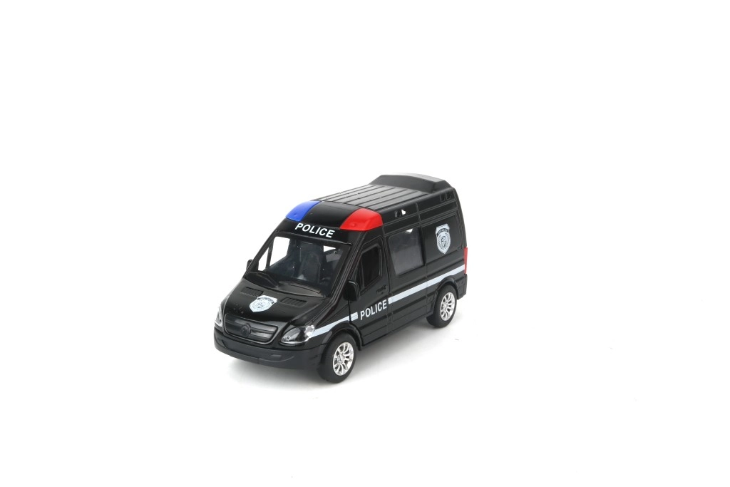 Mașină de poliție neagră, cu girofaruri albastre-roșii și inscripții POLICE, stimulează jocul plin de acțiune și urmăririle – doar trage înapoi și pornește.