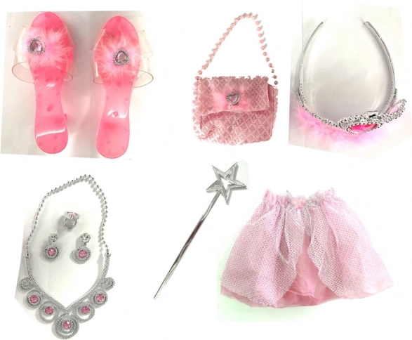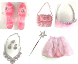 Acest set roz fermecător pentru micile prințese transformă fiecare după-amiază într-o aventură de basm. Copiii vor îndrăgi combinația dintre fustița ușoară, pantofiorii drăgălași și poșeta care completează întreaga ținută regală. Perfect pentru deghizări, teatru acasă, carnaval și petreceri de aniversare.