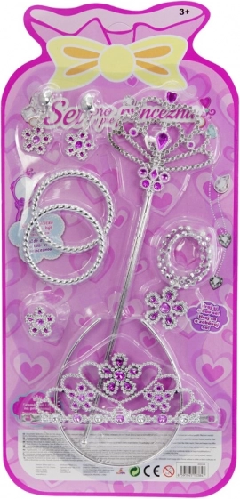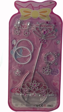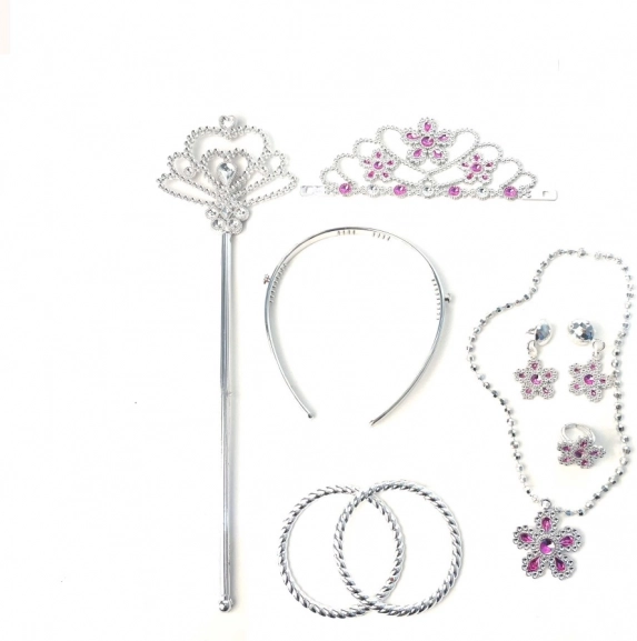 În funcție de versiune, pe lângă coroniță, baghetă, cercei și brățări, setul poate include și colier, inel sau bentiță – toate într-un stil unitar, de prințesă.