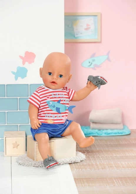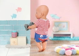 Oferă-i păpușii tale o adormire stilată cu pijamaua BABY born cu motiv oceanic. Tricoul roșu‑alb în dungi cu rechin și pantalonii de jos albaștri cu zâmbet de rechin vor aduce un zâmbet pe fața fiecărui mic îngrijitor. Botoșeii gri în formă de rechin completează perfect ținuta și susțin jocul imaginar.