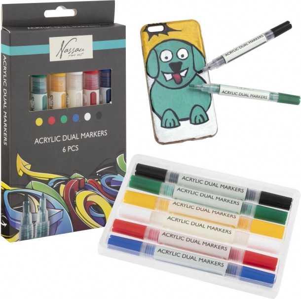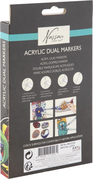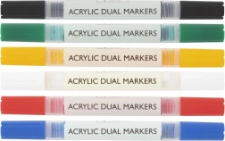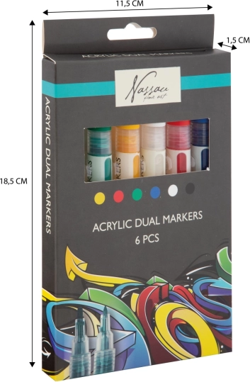 Acest set practic de markere acrilice duale oferă nuanțe vii, opace și confortul a două vârfuri în fiecare marker. Cu ele poți realiza inscripții, ilustrații, decorațiuni și proiecte DIY – de la pictură pe hârtie și carton până la decorarea pietricelelor, lemnului sau pantofilor.
