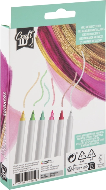 Descoperă posibilitățile creative cu acest set de șase markere metalice Craft. Datorită pigmenților bogați, culorile au nuanțe intense și vii, ideale pentru desene detaliate și acoperirea uniformă a suprafețelor mai mari. Creează ilustrații originale, decorațiuni și bijuterii DIY fără limitele imaginației.